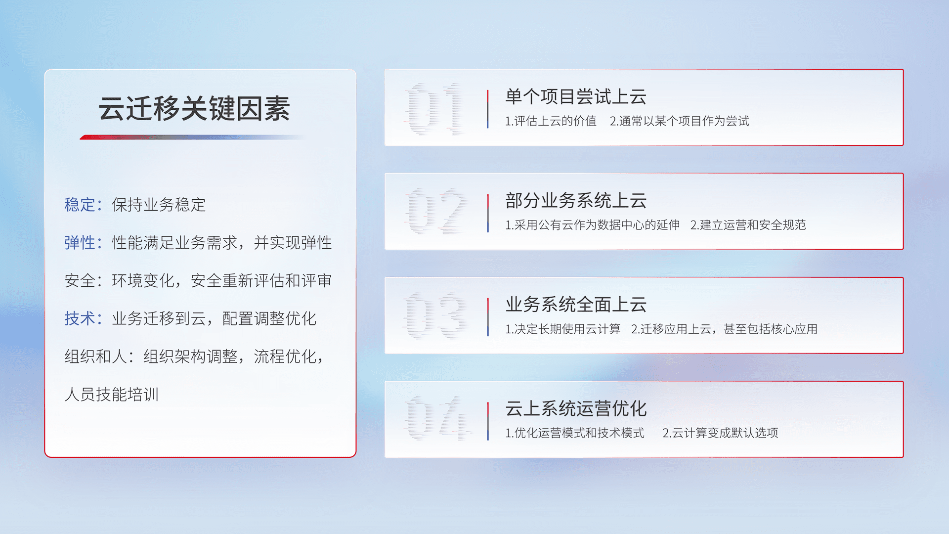 结合实际业务,,,,从规划设计、、、云平台选型、、云原生改造、、、、数据迁移、、、、集成交付,,迁移全过程为客户识别最佳上云路径,,,做好风险识别管理,,设计网络架构、、、身份权限、、、、安全审计合规、、操作审计、、、、日志审计、、监控告警策略、、、多站点容灾设计等,,,,对云上基础设施进行整体规划,,,,提升IT治理水平,,,以满足弹性、、高可用、、、高性能的需求。。