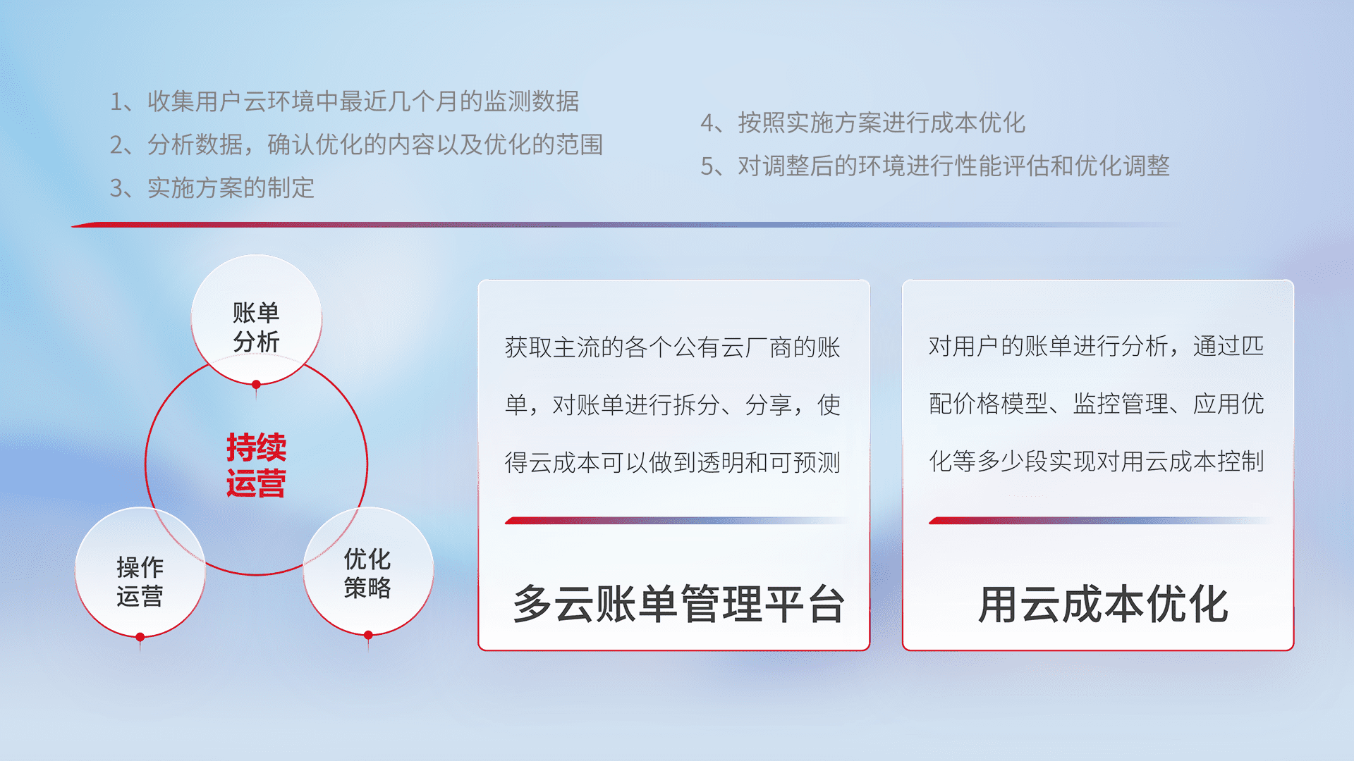 通过多云纳管,,以统一的资源数据模型把客户的云资源进行抽象和封装,,进而实现对多云资源的统一操作,,,,保障云资源管理的可靠性、、、稳定性与可用性。。。量身定制化运维内容,,,配置、、、、开发运维、、、补丁管理、、、备份、、监控、、认证和访问管理、、审计和日常巡检等,,,保障在用云过程中的可靠度,,,,稳定度以及高可用率。。。