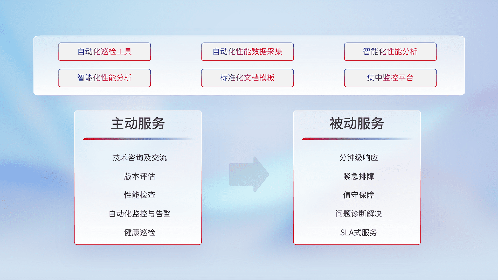 智能化工具和标准化文档,,保障服务质量,,,提供主动服务(包含技术咨询、、、版本评估、、、性能检查、、、自动化监控与告警、、、健康巡检)和被动服务包含(分钟级响应、、、紧急排障、、、、值守保障、、、、问题诊断解决、、SLA服务)。。。